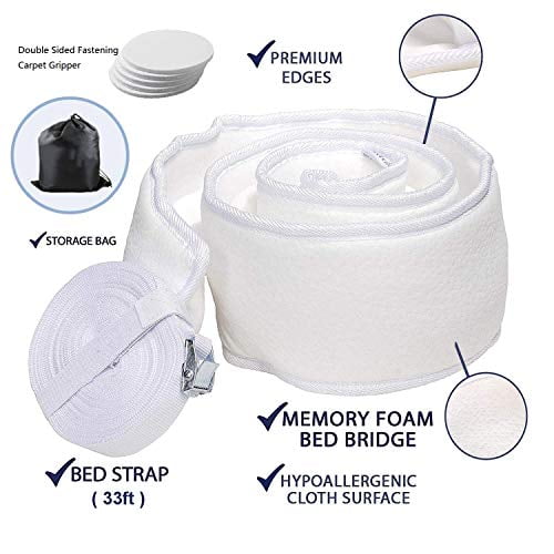 Bed bridge allows you to place 2 twin size mattresses together to create an almost king size bed to sleep together comfortably. Easy king bed doubling system. Wide bed gap filler strap bed bridge twin to king converter mattress extender. Seam where beds are joined is hidden. (of course, i used a 20% off bed, bath and beyond coupon to buy it too!)